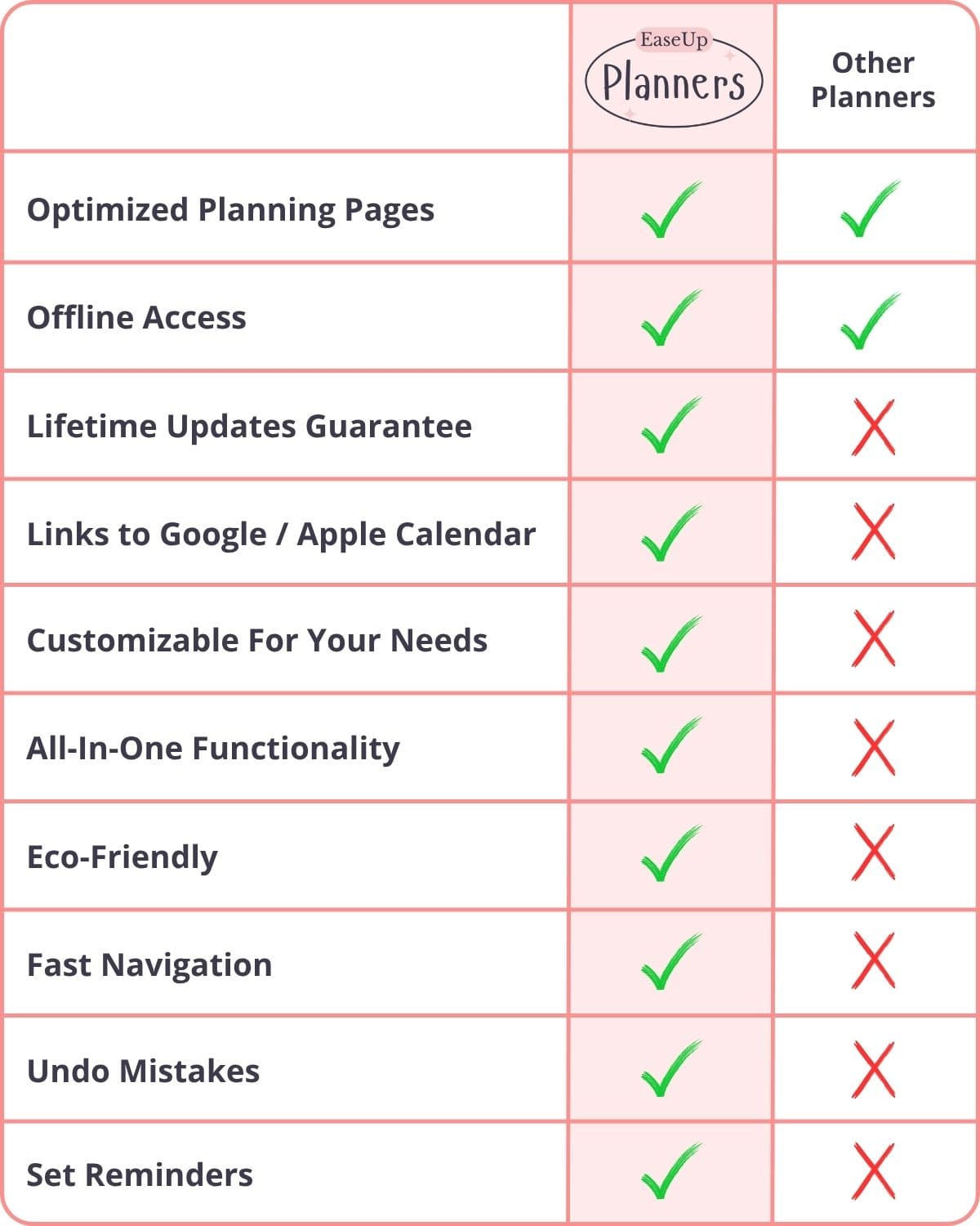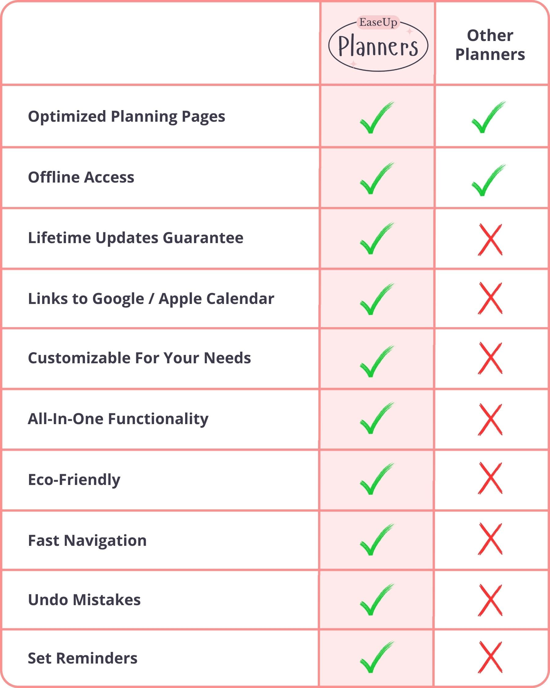 That’s why I created the EaseUp Digital Planner. It’s packed with customization options, works easily with Google and Apple calendars via integrated links, and offers FREE updates for upcoming years, so you never have to buy another planner again.