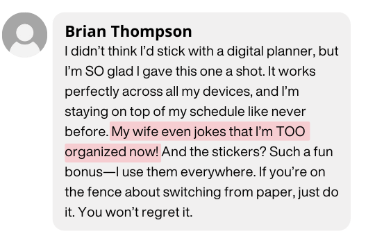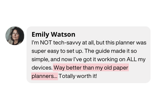 "I was skeptical about going digital, but this planner has completely transformed how I organize my week. No more scattered notebooks and sticky notes everywhere."